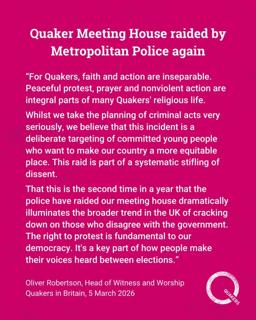 ”Att detta är andra gången på ett år som polisen har gjort en razzia mot vårt möteshus belyser dramatiskt den bredare trenden i Storbritannien av att slå ner på dem som inte håller med regeringen. Rätten att protestera är grundläggande för vår demokrati. Det är en viktig del av hur människor gör sina röster hörda mellan val.”